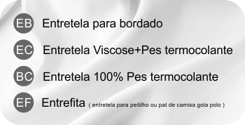 Para bordado EB(35g e 70g), Entretela viscose+pes termo colante EC(30g,40g,50g,80g), Entretela 100% pes termocolante BC(40g,50g, 65g, 90g e 130g). TNT Dupla face (aplicações em bordados e patchwork).